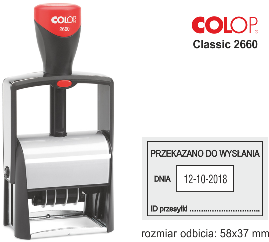 Niezwykle trwały datownik szkieletowy z płytką tekstową o powierzchni odbicia: 58x37 mm.
