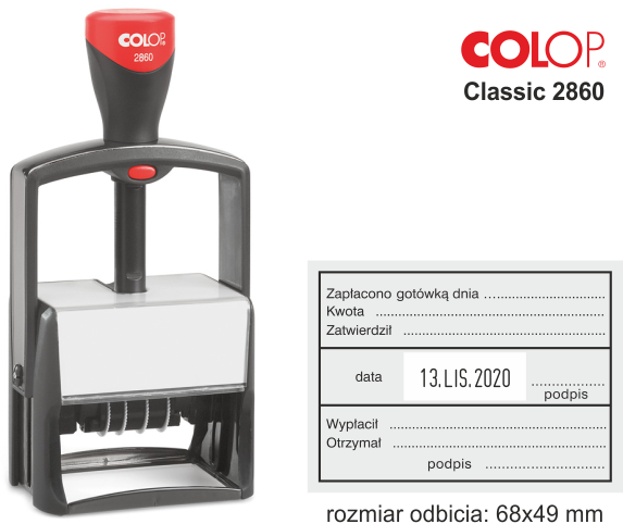 Niezwykle trwały datownik szkieletowy z płytką tekstową o powierzchni odbicia: 68x49 mm.