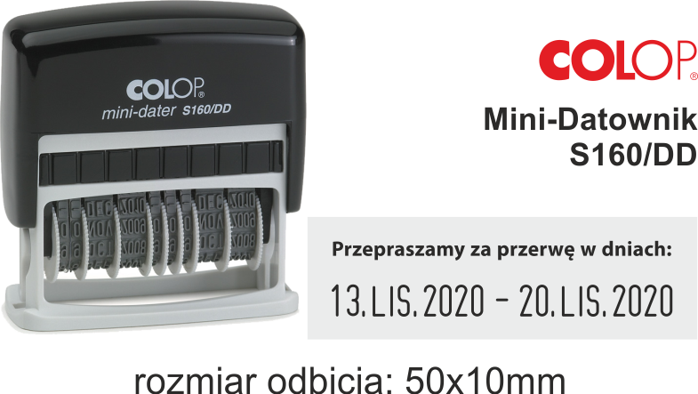 Najmniejszy samotuszujący podwójny datownik z miejscem na tekst powyżej dat.
