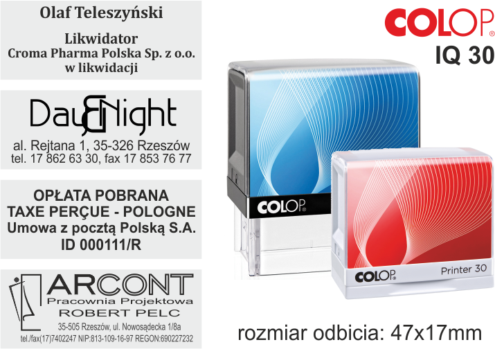 Format pieczątki: [47 x 17 mm] Maksymalna liczba wierszy: 6
