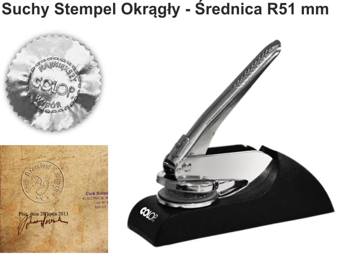 Suchy stempel ręczny z wkładem o średnicy 51 mm.