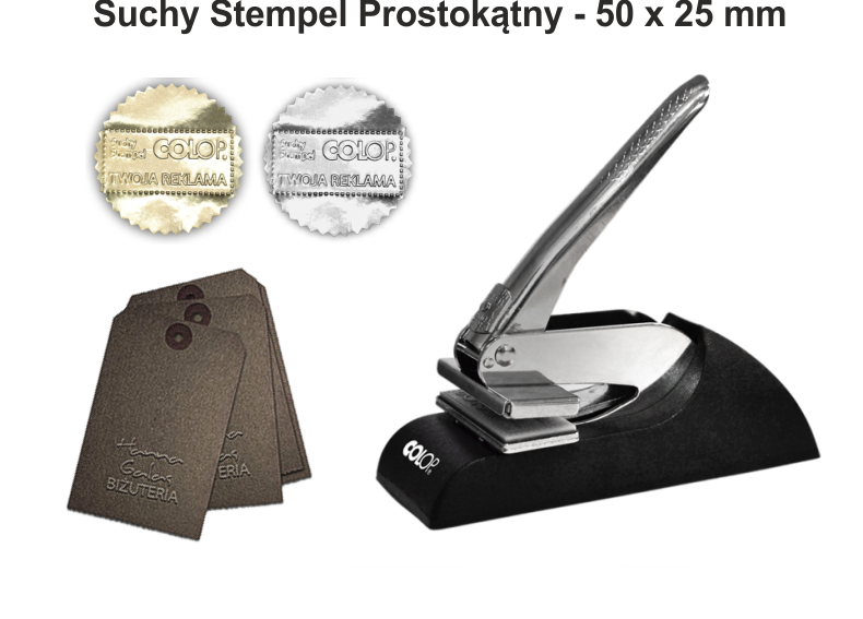 Suchy stempel ręczny z wkładem prostokątnym 50x25 mm.